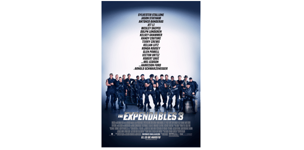 Reparto (Personaje): Sylvester Stallone (Barney Ross), Jason Statham (Lee Christmas), Antonio Banderas (Galgo), Jet Li (Yin Yang), Wesley Snipes (Doc), Dolph Lundgren (Gunnar Jensen), Kelsey Grammer (Bonaparte),Terry Crews (Hale Caesar), Randy Couture (Toll Road), Kellan Lutz (John Smilee), Ronda Rousey (Luna), Glen Powell (Thorn), Victor Ortiz (Mars), Robert Davi (Vata), junto a Mel Gibson (Conrad Stonebanks), Harrison Ford (Drummer) y Arnold Schwarzenegger (Trench)