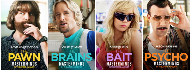 On behalf of Relativity Studios, we are pleased to share four new character posters for the upcoming movie, MASTERMINDS. Meet…THE PAWN (Zach Galifianakis)… THE BRAINS (Owen Wilson)… THE BAIT (Kristen Wiig)… and THE PSYCHO (Jason Sudeikis)… and get ready to embark on the scheme of a lifetime this summer on August 19th!