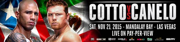 Cotto vs. Canelo, a 12-round fight for Cotto’s WBC and Ring Magazine Middleweight World Championships, takes place Saturday, Nov. 21 at the Mandalay Bay Events Center in Las Vegas. The fight is presented by Roc Nation Sports, Golden Boy Promotions, Miguel Cotto Promotions and Canelo Promotions and sponsored by Corona Extra; Mexico, Live it to Believe it! and O’Reilly Auto Parts. The event will be produced and distributed live by HBO Pay-Per-View beginning at 9:00 p.m. ET/6:00 p.m. PT.