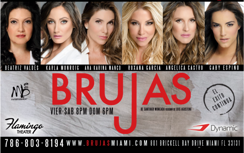 BRUJAS está en el Flamingo Theater Bar: 801 Brickell Bay Drive Miami, Fl 33131. Para adquirir las entradas: www.brujasmiami.com o por teléfono al 786-803-8194