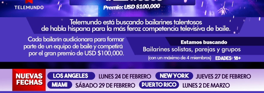 TELEMUNDO BUSCA TALENTOSOS BAILARINES PARA UNA ACLAMADA COMPETENCIA DE BAILE QUE POR PRIMERA VEZ LLEGA A EE.UU. Bailarines 18 años en adelante podrán competir por el gran premio de $100.000 dólares al probar sus destrezas de baile solos, en pareja o grupos Las audiciones locales que se realizarán en Los Ángeles, Nueva York,… Continue reading Telemundo audiciones abiertas buscando bailarines